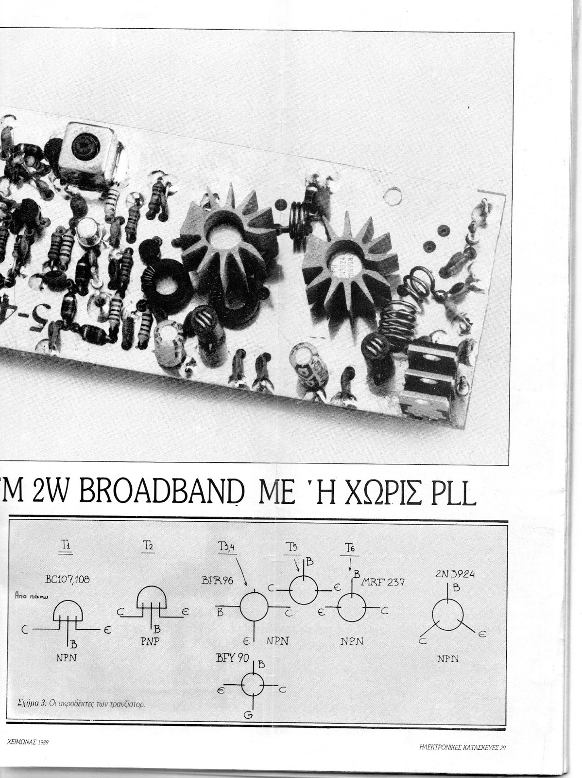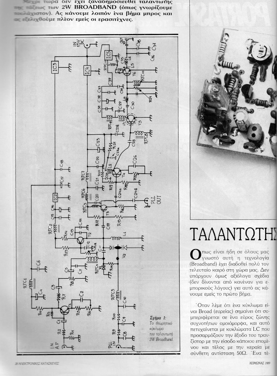 Η συχνότητα Fc που αρχίζει να ''κόβει'' αρμονικές το φίλτρο LPF πρέπει να είναι λίγο μεγαλύτερη από την συχνότητα εκπομπής. Για συχνότητα εκπομπής π.χ. 1431Khz --> επιλέγετε Fc=1460Khz -->C1=C3=1800pf, C2=3600pf (2 παράλληλα συνδεδεμένοι πυκνωτές των 1800pf), L1=L2=7,28μΗ (23 σπείρες πηνίο σε πλαστικό τούμπο διαμέτρου 1,7cm -από το ρολό του χαρτιού ταμειακής- με πηνιόσυρμα διαμέτρου 0,5mm). Το φίλτρο LPF συνδέεται μεταξύ PLL και πυκνωτή εισόδου 100pf του σήματος RF της λυχνίας.